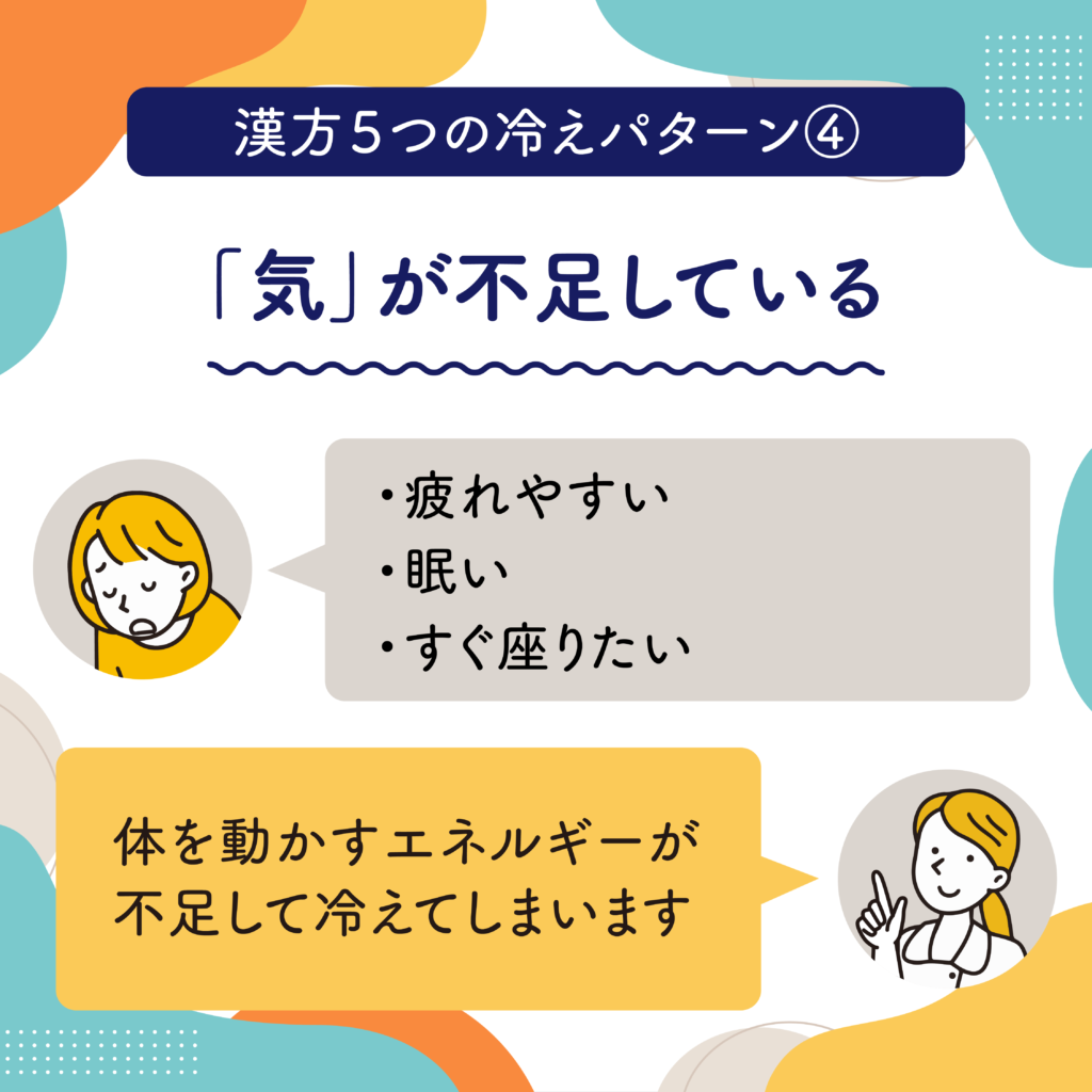 気=エネルギーが足りないため、疲れやすく、冷えやすくなります。