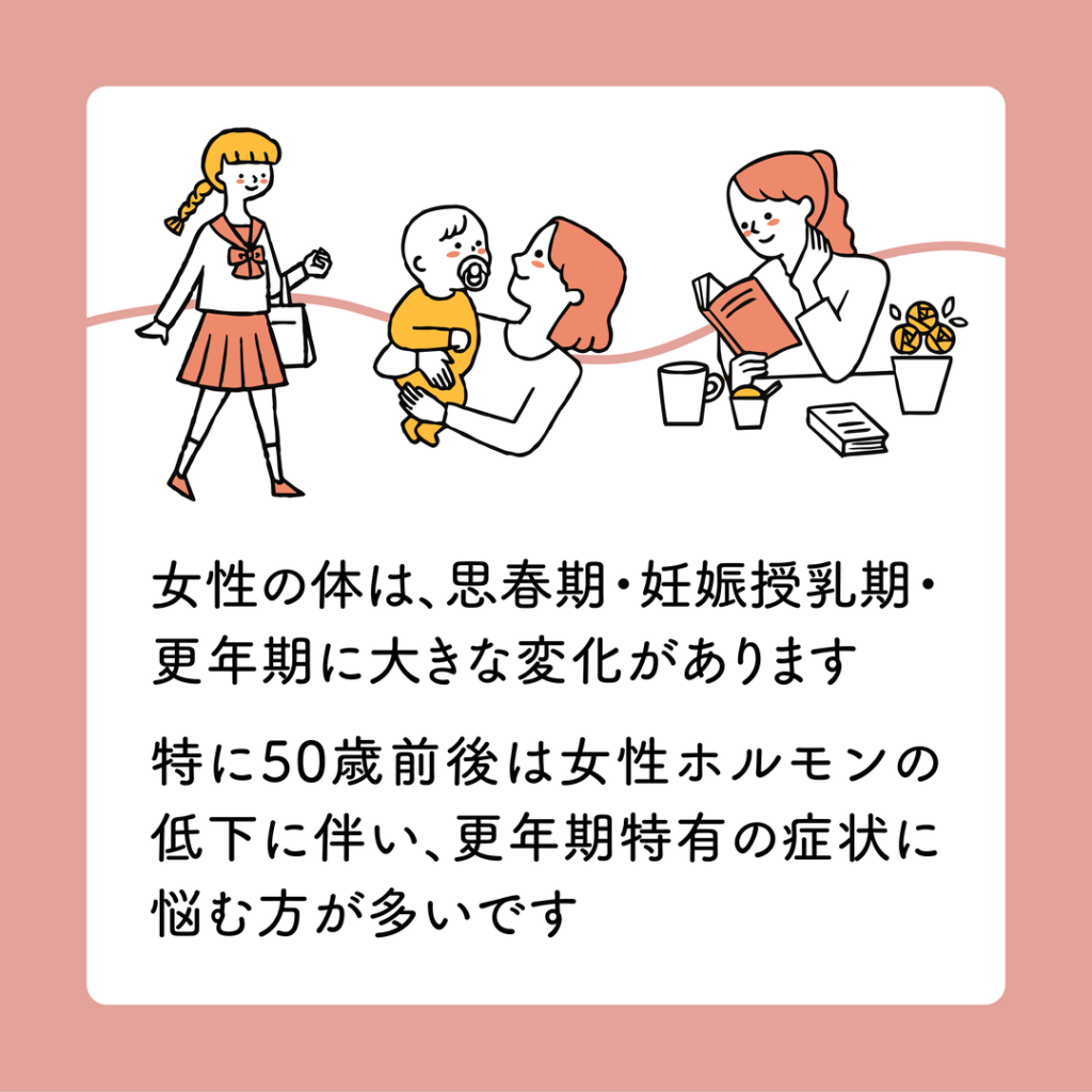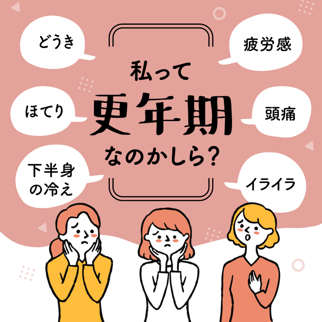 一般的に閉経をはさむ前後10年間を更年期といい、女性ホルモンのエストロゲンの減少に伴い、様々な更年期特有の諸症状が出てきます。