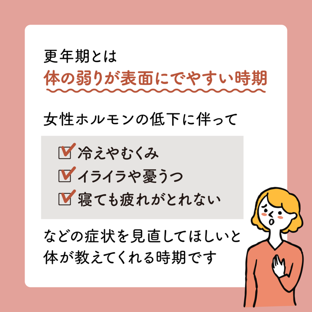 ホットフラッシュやイライラ、下半身の冷えや、頭痛、不眠、腰痛などもこの時期に多いご相談です。