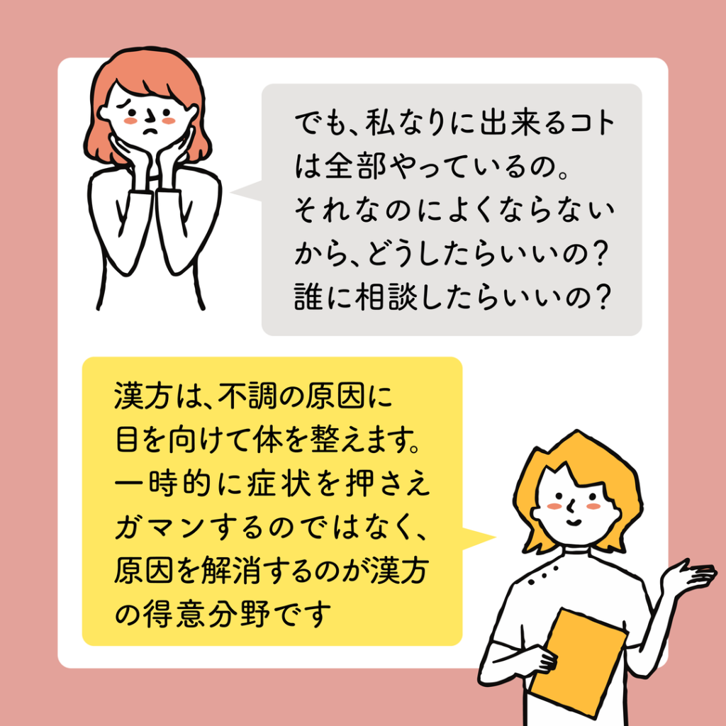 実際に、漢方はお一人お一人の悩みや困りごとを根本から解決する手段として役立ちます。