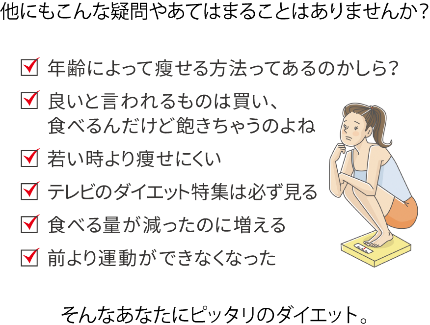 お一人おひとりの生活環境は違うものです。仕事に家事、育児と常に時間に追われて食事もつい早食いになってしまう方もいます。スポーツジムで運動したり、エステ、ヨガなどにも行ってみたいけど時間を作れない方もいます。便秘の方や、睡眠時間が足りない方もいます。食事に気を付けているのに痩せにくい方、膝の痛みのある方もいます。