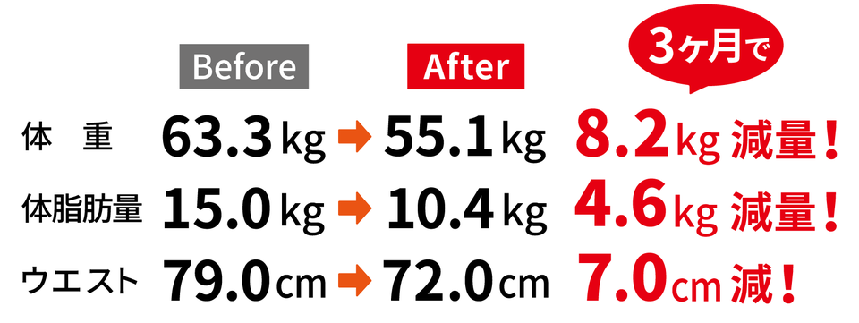 目標だった-5kgを達成し、ご自身でも一番調子が良かった30代後半~40代のときの体重の55~56kgくらいの体重になり嬉しいです。10日で1kgずつ減るペースで、理想のペースでダイエットできましたね。