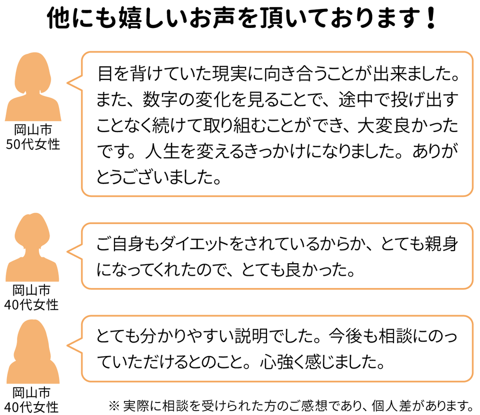 本当に楽に痩せれました。最初は少しストレスがあったけどすぐ慣れました。食べたいストレスも少なかったです。料理も自分でしてたし、体重をグラフにしてやるのが楽しかったです。お金はかかったけど、それに合う成果が得られたので、大満足でした。